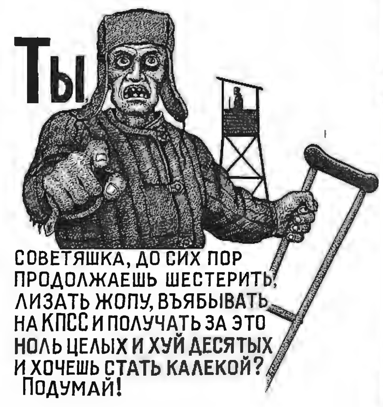 (Below) “A tattoo widespread in the camp zone in the 1950s and I 960s. An imitation of a well-known Civil War poster.” It reads: “You little Soviet shit, you are still kow-towing, arse-licking and flogging away for the CPSU and being paid zero point fuck-all and do you want to be a cripple? Think about it!”